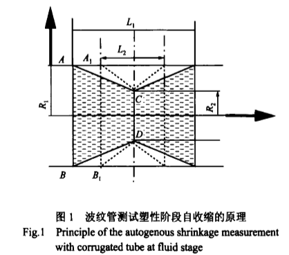 对塑性阶段的水泥基材料,采用长度来度量是没有意义的,流体只能以体积来计量。如果流体的形状固定,则流体的体积就可以以长度来计量。如图1所示的波纹管具有特殊的特性。波纹管沿轴向方向的刚度与径向方向的刚度相比忽略不计,换言之,沿轴向方向的变形能力远大于沿径向方向变形能力。对于这样的波纹管,体积的变化将全部以长度变化的形式来体现。